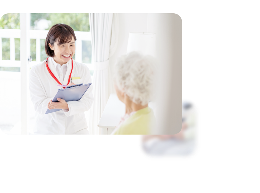 看護師や医療専門職がご自宅に訪問し、健康チェック(血圧測定、体温管理など)や褥瘡(床ずれ)の予防・処置、点滴やカテーテルの管理、服薬指導、リハビリテーションの補助などを提供いたします。